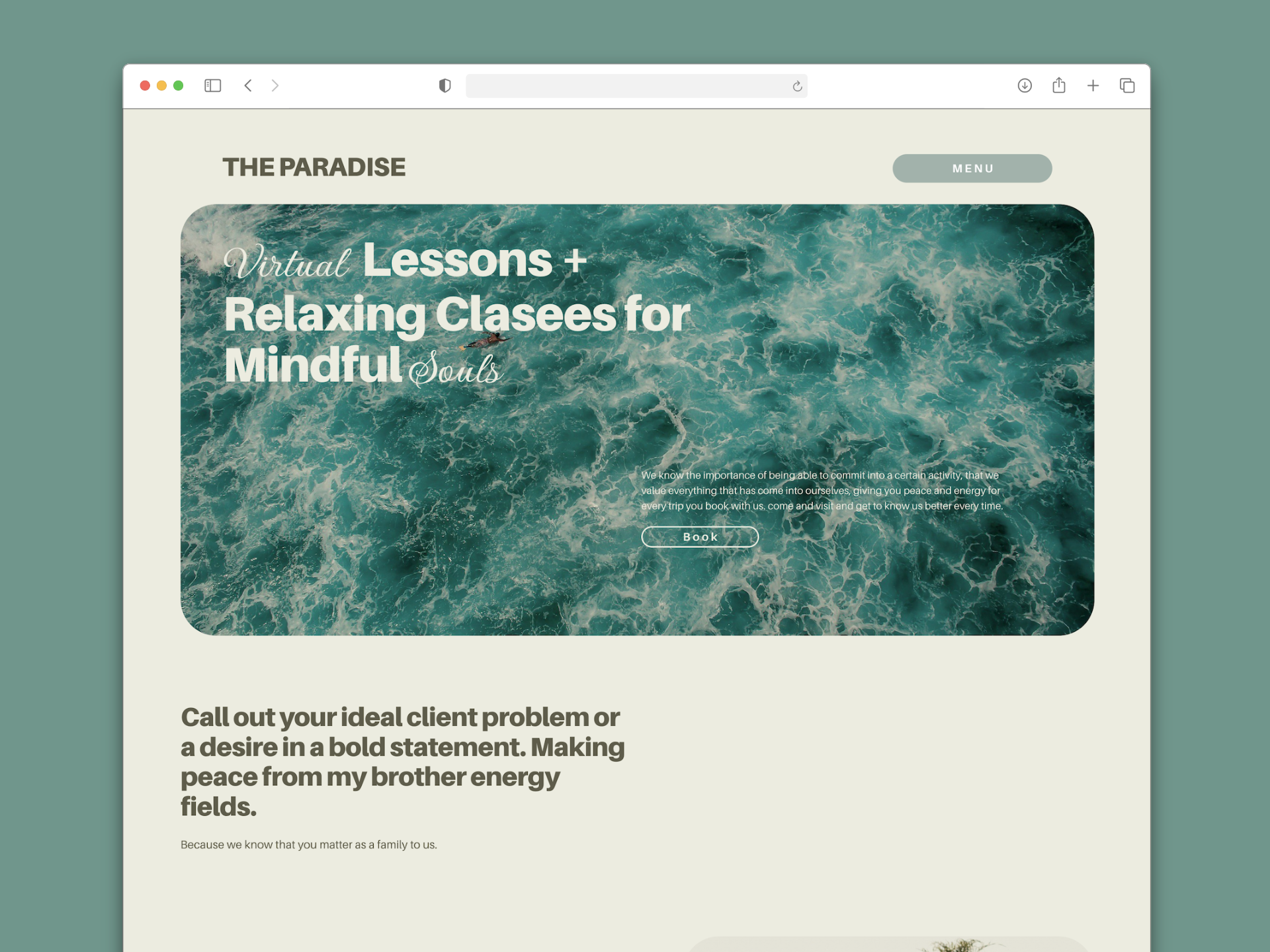 El sitio web fue diseñado para transmitir calma, confianza y conexión emocional a través de una estética minimalista, visuales naturales y una navegación clara que guía al usuario a descubrir los servicios y profundizar en su proceso de bienestar.