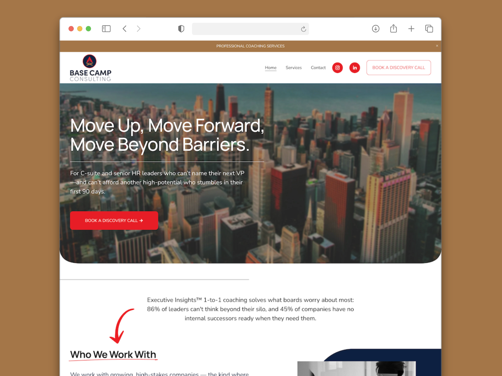 Base Camp Consulting es una firma de coaching ejecutivo que trabaja con líderes senior y equipos directivos en empresas de alto impacto. Necesitaban un sitio web que comunicara claramente su propuesta de valor, posicionara su experiencia en liderazgo estratégico y conectara con ejecutivos que enfrentan decisiones críticas en momentos de crecimiento.