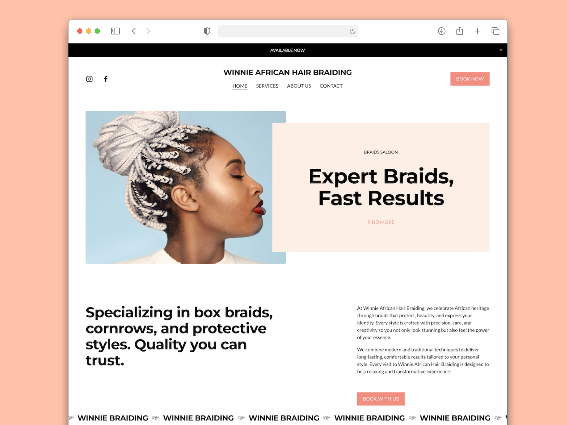 Winnie Saloon es un salón especializado en trenzas africanas y estilos protectores, enfocado en resaltar la belleza y la identidad cultural de cada cliente. Necesitaban un sitio web que mostrara claramente su experiencia, la calidad de su trabajo y facilitara la reserva de citas para nuevos clientes.