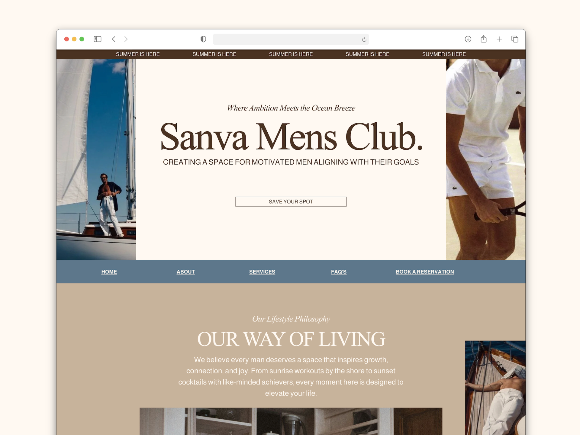 El sitio web fue diseñado para comunicar su filosofía de vida, transmitir exclusividad y crear una experiencia visual elegante que motive a los visitantes a formar parte del club y reservar su lugar de forma clara y natural.